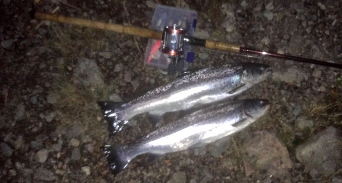 Fiskade 1,5 timmar idag. Hände inget första kvarten. Sen på 40 min fick jag dom på bild 1,7 kg & 1,6Kg. Släppte tillbaka 2st öringar på 47cm & 45cm och så tappade jag 2st. Ena som jag tappa såg ut att vara runt 3kg. Nicklas M tyckte jag skulle ge mig. Inte ett hugg för honom på spinnfluga. Tog alla mina på skeddrag. Mr Storvreta ska ha drillat 10st på kort tid. 5 av dom på land. Han behöll en av dom. 1,3 kg. Kul att drilla många ;)
