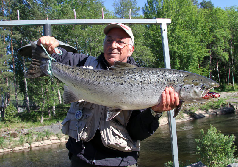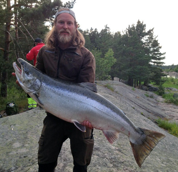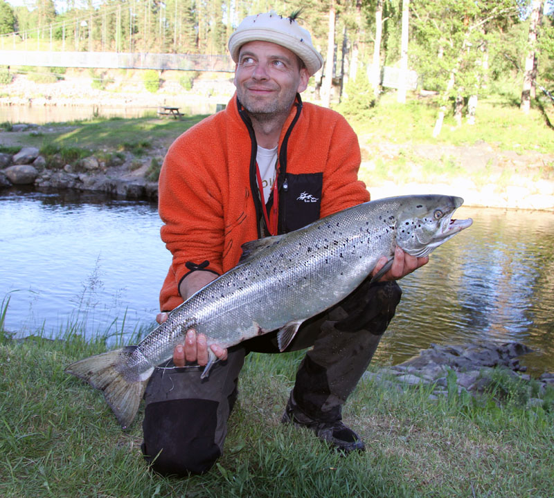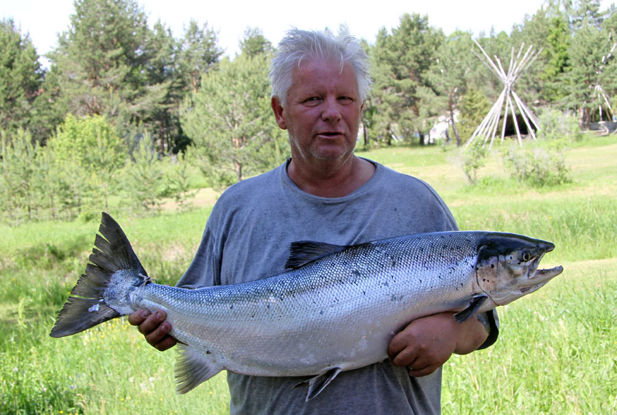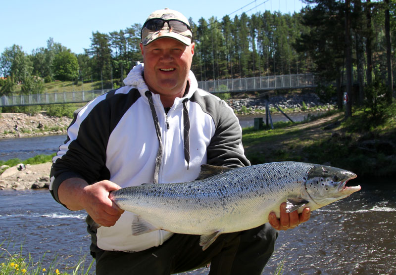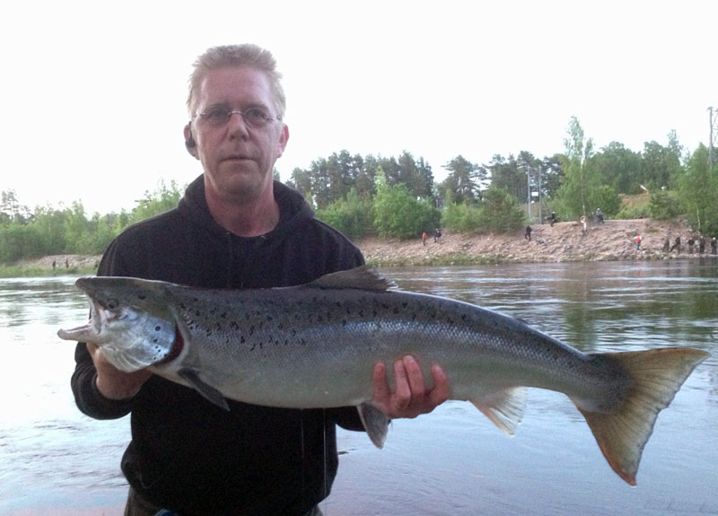 Peter Boström tog sig en lax på kistan klockan 11:30. Vikt 12,0 kg. (Bilden nedan)