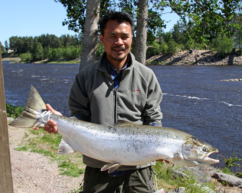 Krisada NOI Thabburi med första invägda laxen. Togs vid skravlet. Vikt 11.25 kg