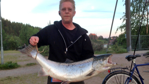 Dagens hittills största Lax. Anders Ingels tog denna megalax vid pumpen. Vikt 21,6 kg