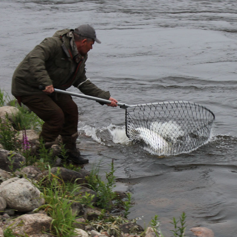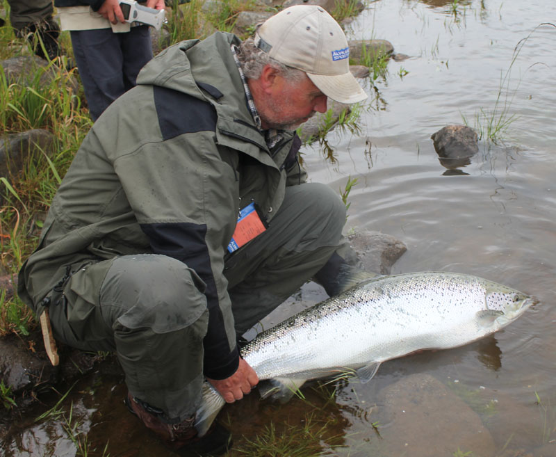Tomas Lännström sätter tillbaka min felkrokade Lax. Flugan satt i styrfenan.