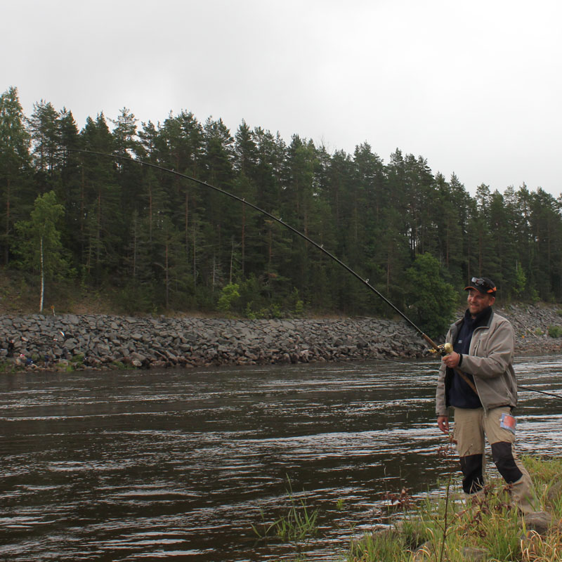 Tog ca 15 min att få upp Laxen. Man vart lite besviken för laxen högg på flugan så jag trodde den satt rätt. Medans jag drilla denna så va det upp en till lax. Killen ovanför mig hade fjäll på sin krok samtidigt som jag tog min. Fiskaren nedanför mig tappa en några minuter före min. Den tappades på grund av en dålig knut. Tomas Lennström tog dagens största Lax 12,4 kg