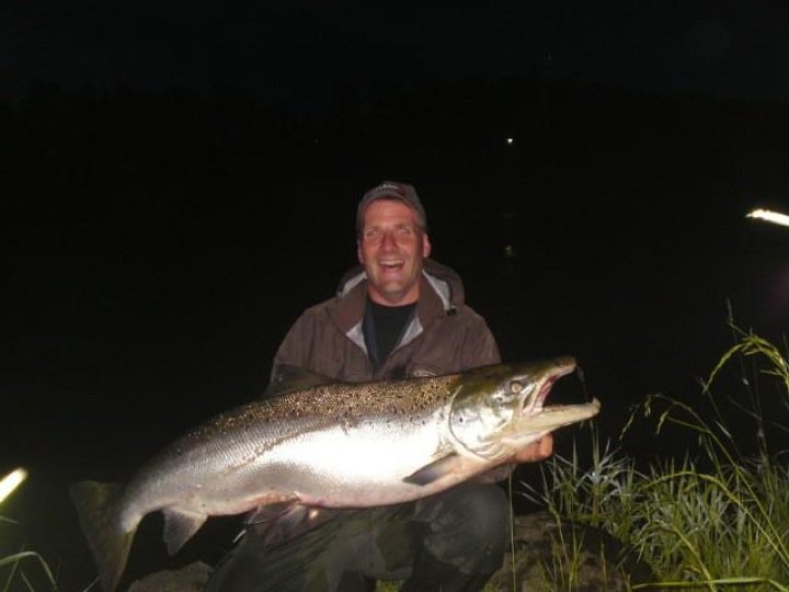 Bilden till höger är Yngve Bergströms felkrokade lax. Den satt rätt först och helt plötsligt satt kroken i magen. Yngve som denna dag (Lördag) tog en lax på 11,5 kg och 2st felkrokade. inte illa.